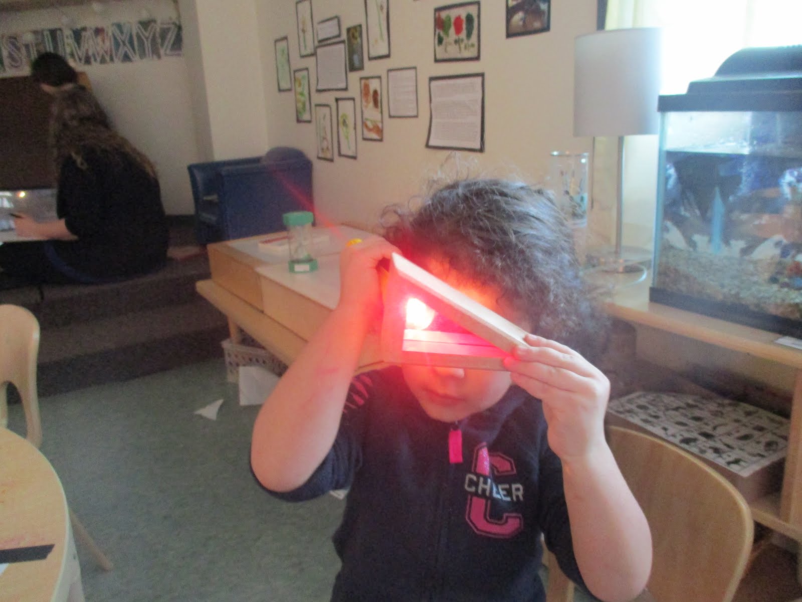 When we previously explored the flashlights, we noticed that many of the children were shining their flashlights on various parts of the room. They shine their flashlights behind furniture, underneath tables, and in the bathroom when the lights were off. We wanted to extend the children's thinking about how the intensity of the light from flashlight can change depending on the surrounding lighting. The children use their flashlights to explore the gross motor room. They compared how their flashlight looked near the windows versus in the dark closet. They very curious about how the light from their flashlight traveled through the white screen, and the person on the opposite side of the screen was able to see the light.